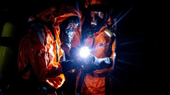 In weiterer Folge konnte ein Trupp unter Schutzstufe 3 Anzügen, dies ist der höchst mögliche Schutz für die Feuerwehrmänner, den havarierten Container sichern und durch weitere Maßnahmen die Gefahr eindämmen bzw. beseitigen.