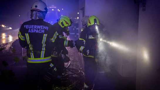 Dafür wurde seitens der Gemeinde ein Abbruchobjekt zur Verfügung gestellt. Nicht alle Tage hat man die Gelegenheit, Übungen mit echtem Feuer unter realen Bedingungen durchzuführen. Es war neben den Feuerwehren Aspach, Migelsbach, Wasserdobl und Wildenau auch das Atemschutzfahrzeug der FF Munderfing vor Ort.