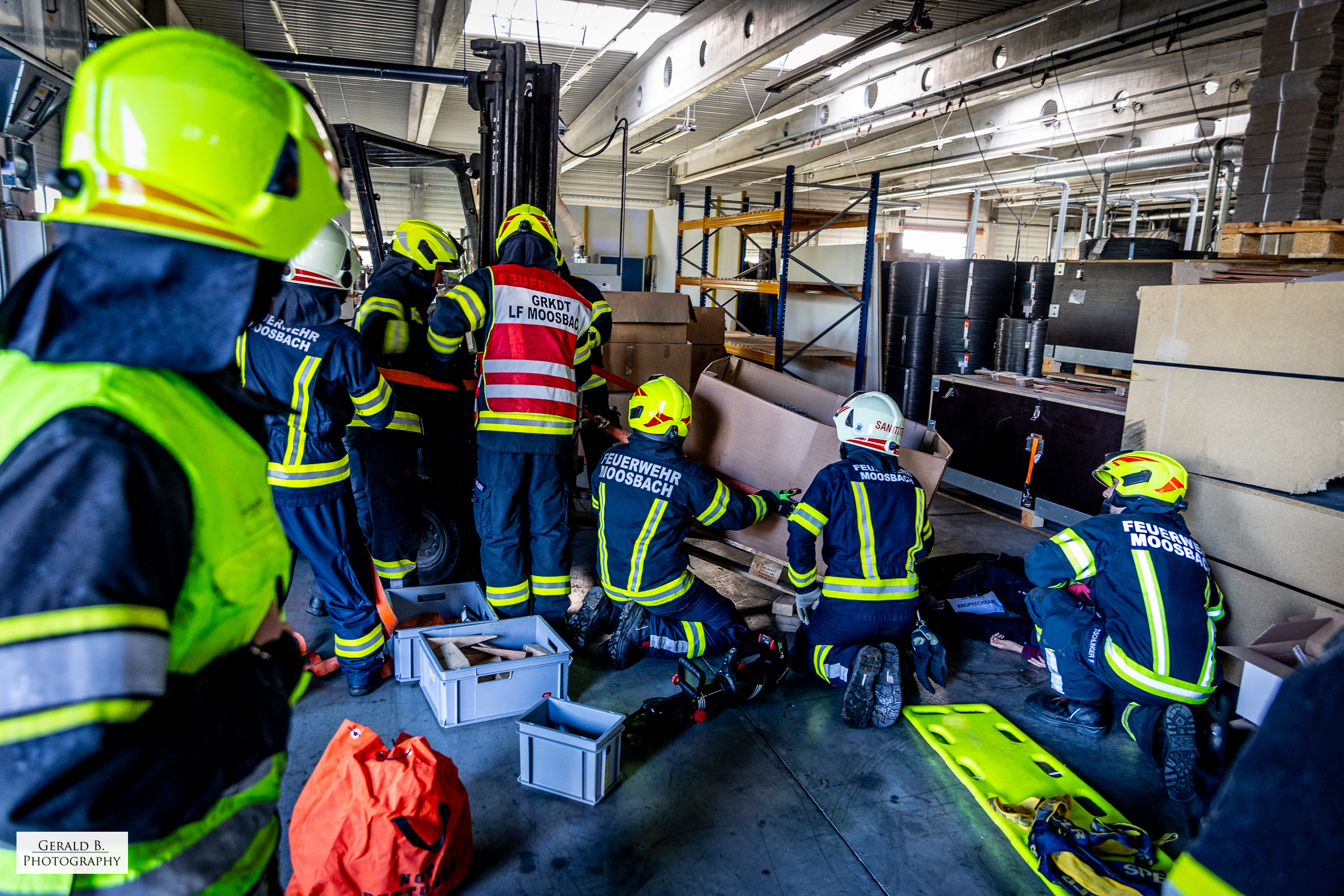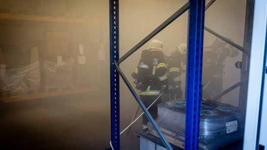 Übungsannahme war ein Brand in einem Kartonagenlager. Aufgaben der Einsatzkräfte waren die Rettung von insgesamt fünf im Rauch eingeschlossenen Personen, sowie die Brandbekämpfung. Parallel dazu musste außerdem ein Arbeitsunfall mit zwei eingeklemmten Personen abgearbeitet werden.
