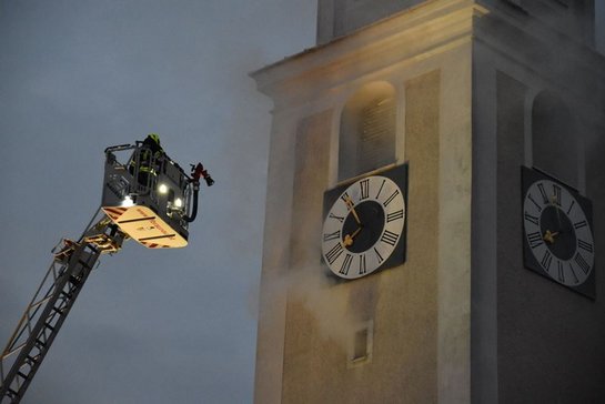 Die wenig später eintreffende Drehleiter der Feuerwehr Braunau nahm direkt vor der Kirche Aufstellung um die Erkundungs- und Löschtätigkeiten am Kirchturm zu unterstützen. Zudem galt es das Hauptschiff der Kirche zu schützen.