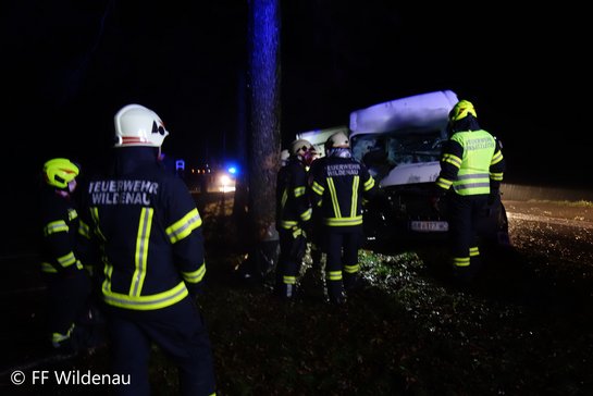 Am 12.12.2020 wurde die FF Wildenau und die FF Aspach um 20:45 zum Einsatz VU „LKW gegen Baum“ mit eingeklemmter Person alarmiert. Ein aus Richtung Mettmach kommender Lenker eines Kleinbusses war ins Schleudern gekommen, und kollidierte mit einem Baum, der das Fahrzeug im Frontbereich total zerstörte.