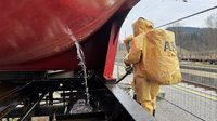 - Auffangen und Umpumpen des Gefahrstoffs: hier wurde nach Auffangmaßnahmen unter Chemikalienschutzanzügen (CSA) ein Pumpensystem in Einsatz gebracht