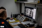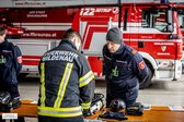 Nach der Belastung in der Übungsstrecke folgt die Station „Pflege und Wartung“. Hier werden Atemschutzgerät und Maske ordnungsgemäß abgelegt, die Atemluftflaschen gewechselt, eine hochdruckseitige Dichtprüfung durchgeführt und die Funktionsfähigkeit der Restdruckwarnung überprüft. Außerdem müssen die Teilnehmer Fragen zur Wiederherstellung der Einsatzbereitschaft beantworten und aus den tatsächlichen Druckwerten ihren persönlichen Luftverbrauch berechnen – ohne Taschenrechner, der Rechenweg ist mitzuschreiben.