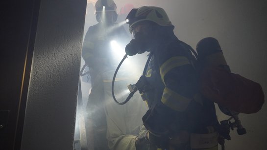 Beim ersten Szenario galt es über den Balkon mittels einer Leiter in den ersten Stock zu gelangen. Ziel war es, zwei Personen zu finden und zu retten und gefährliche Stoffe zu bergen.