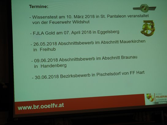 HAW Erwin Dürnberger berichtete über die bevorstehenden Aufgaben, wie den Wissenstest, der heuer noch nach den geltenden bestimmungen durchgeführt wird, JFLA Gold, die nötigen Erprobungen und Voraussetzungen und verwies auf die Homepage des OÖ Landesfeuerwehrverbandes, wo sämtliche Unterlagen zu finden sind. Da heuer ein Wahljahr ist, und viele neue Jugendbetreuer diese Amt übernommen haben , ist es besonders wichtig, diese Informationen aus erster Hand zu erhalten.