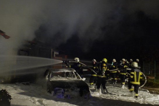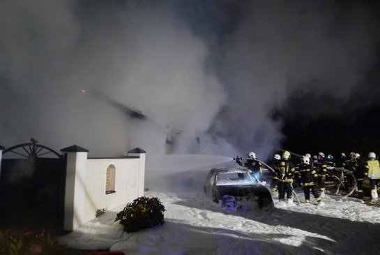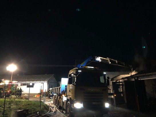 In der Nacht vom 31.10. auf dem Allerheiligentag wurde die FF Tarsdorf gemeinsam mit den Nachbarfeuerwehren Ernsting und Ostermiething zu einer in Vollbrand stehenden Garage im Ortsteil Wolfing alarmiert. Da die Einsatzadresse nicht weit vom Ernstinger Feuerwehrhaus entfernt ist, waren diese bereits vor der FF Tarsdorf vor Ort und begannen mit dem Aufbau der Zubringerleitung für das Tanklöschfahrzeug vom nahegelegenen Löschwasserbehälter. Die TLF Besatzung stellte gleich einen Atemschutztrupp, welcher mit unserem C-Schnellangriff zum Gebäude vorging. Die restliche Mannschaft ging mit den Strahlrohren zur weiteren Brandbekämpfung und zur Vermeidung, dass das Feuer auf weitere Gebäude in der Siedlung übergreift. Die Flammen sind bereits beim Eintreffen der Einsatzkräfte auf einem daneben abgestellten PKW übergegriffen. Mittels Schaummittel konnte dieser gelöscht werden. Vom Hausbesitzer wurden wir informiert, dass sich noch eine Gasflasche im Inneren befindet. So gleich machte sich der ATS Trupp auf die Suche nach dieser. Die Drehleiter der FF Ostermiething verrichtete die Löscharbeiten aus der Höhe. Das Löschfahrzeug Logistik der FF Tarsdorf half beim Verlegen einer weiteren 800 m Zubringerleitung mit, welche aber dann doch nicht mehr benötigt wurde. Nach ca. einer Stunde waren die Flammen gelöscht und es konnte "Brand aus" gegeben werden. Im Anschluss folgten noch Nachlöscharbeiten. Da das Gebäude und der Dachstuhl sehr stark einsturzgefährdet waren, wurde mit Hilfe eines LKW-Krans der Fa. Hager noch Abbrucharbeiten durchgeführt. Im Einsatz standen insgesamt 4 Atemschutztrupps (ein weiterer auf Reserve), elf Feuerwehrfahrzeuge sowie die Polizei und das Rote Kreuz.