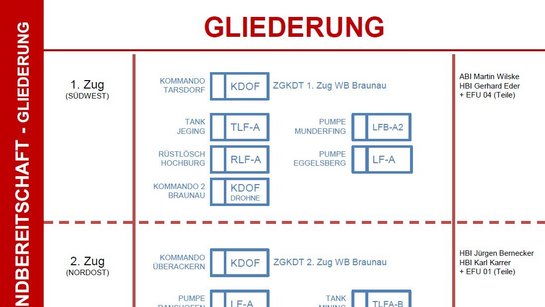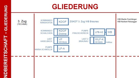 Die Struktur unserer Züge ermöglicht einen flexiblen Einsatz auch dann, wenn einzelne Feuerwehren oder Fahrzeuge bereits durch vorhergehende Alarmierungen gebunden sind. Durch diese Aufteilung kann der verbleibende Zug aus einem anderen Bereich des Bezirks effektiv in den Einsatz gehen.